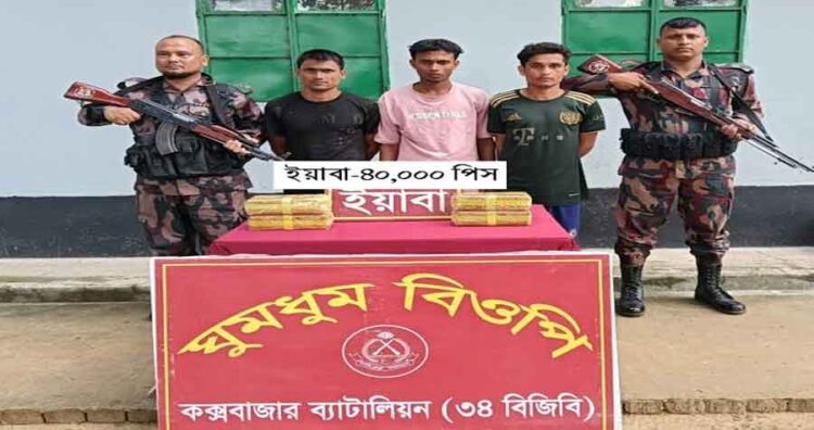 নাইক্ষ্যংছড়ির ঘুমধুম সীমান্তে বিজিবি মোট ৪০ হাজার ইয়াবাসহ তিনজন রোহিঙ্গা মাদক কারবারিকে আটক করেছে। এই অভিযান বৃহস্পতিবার (১২ সেপ্টেম্বর) রাত ৩টার দিকে কক্সবাজারের ৩৪ বিজিবি সদস্যরা চালিয়েছেন। বিজিবি জানিয়েছে, গোপন সংবাদের ভিত্তিতে তারা মন্ডলপাড়া এলাকায় টহল জোরদার করে। এ সময় মিয়ানমার দিক থেকে বাংলাদেশে প্রবেশের প্রাক্কালে তিনজনকে ধাওয়া করে আটক করা হয়। তখন তাদের সাথে থাকা ব্যাগ তদন্ত করে ৪০ হাজার ইয়াবা উদ্ধার করা হয়। আটকরা হলেন, উখিয়ার ১৯ নম্বর রোহিঙ্গা ক্যাম্পের ব্লক ডি-৯ এর মৃত হাফেজ আহমেদের ছেলে মো. হাসান (২৫), ব্লক সি-৮ এর আ. রহিমের ছেলে এনাম করিম (২৫), এবং ব্লক এ-৯ এর মো. হাসানের ছেলে মো. আয়াস (২১)। ৩৪ বিজিবির অধিনায়ক লেফটেন্যান্ট কর্নেল এস এম খায়রুল আলম বলেন, বিজিবি শুধু সীমান্তের নিরাপত্তা নয়, পাশাপাশি মাদক ও চোরাচালান প্রতিরোধেও সমানভাবে প্রতিশ্রুতিবদ্ধ। তিনি আরও জানান, আটককৃত আসামিদের বিরুদ্ধে পরবর্তী আইনী ব্যবস্থা গ্রহণ শেষে সংশ্লিষ্ট থানায় সোপর্দ করা হবে।