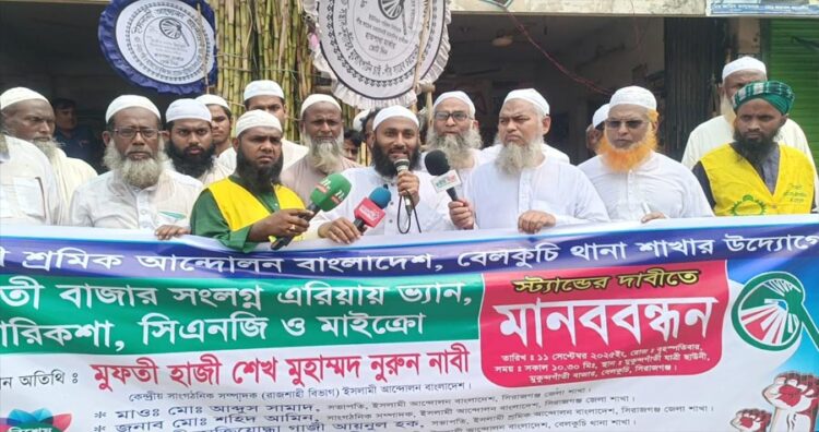 সিরাজগঞ্জের বেলকুচি উপজেলায় ভ্যান, অটোরিকশা, সিএনজি ও মাইক্রোবাস চালকদের ন্যায্য দাবি আদায়ের জন্য ইসলামী শ্রমিক আন্দোলন বাংলাদেশ, বেলকুচি থানা শাখার উদ্যোগে এক মানববন্ধন কর্মসূচি অনুষ্ঠিত হয়েছে। এই মানববন্ধনটি অনুষ্ঠিত হয় বৃহস্পতিবার (১১ সেপ্টেম্বর) সকাল সাড়ে ১০টার দিকে মুকুন্দগাঁতী যাত্রী ছাউনিতে।