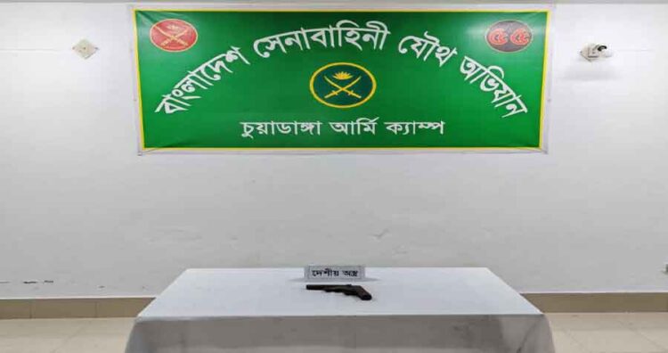 চুয়াডাঙ্গা সদর উপজেলার শংকর চন্দ্র ইউনিয়নের ছয়ঘড়িয়া গ্রামে সেনা বাহিনীর অভিযান চালিয়ে একটি দেশীয় পিস্তল উদ্ধার করা হয়েছে। সেনা সূত্র জানায়, সুনির্দিষ্ট গোয়েন্দা তথ্যের ভিত্তিতে বুধবার (২৪ সেপ্টেম্বর) গভীর রাত থেকে ভোর পর্যন্ত ক্যাম্প কমান্ডার ক্যাপ্টেন মঞ্জুরুল রহমান মাসফির নেতৃত্বে এ অভিযান পরিচালিত হয়। এই সময় স্থানীয় বাসিন্দা সালতাম হোসেনের ছেলে জাইরুল ইসলামের বাড়ির গোয়ালঘর তল্লাশি করে একটি দেশীয় পিস্তল ও একটি মোটরসাইকেল জব্দ করা হয়। তবে অভিযুক্ত জাইরুল ইসলাম পলাতক থাকায় তাকে আটক করতে পারেনি সেনা বাহিনী। উদ্ধারকৃত অস্ত্র ও জব্দ সামগ্রী পরে চুয়াডাঙ্গা সদর থানায় পুলিশের নিকট হস্তান্তর করা হয়েছে। বাংলাদেশ সেনাবাহিনী জানায়, জননিরাপত্তা রক্ষা, আইনশৃঙ্খলা বজায় রাখা ও অপরাধ দমনকে কেন্দ্র করে তাদের নিয়মিত এই ধরনের অভিযান চালানো হয়। ভবিষ্যতেও এ ধরনের অভিযান অব্যাহত থাকবে বলে তারা নিশ্চিত করেছে।
