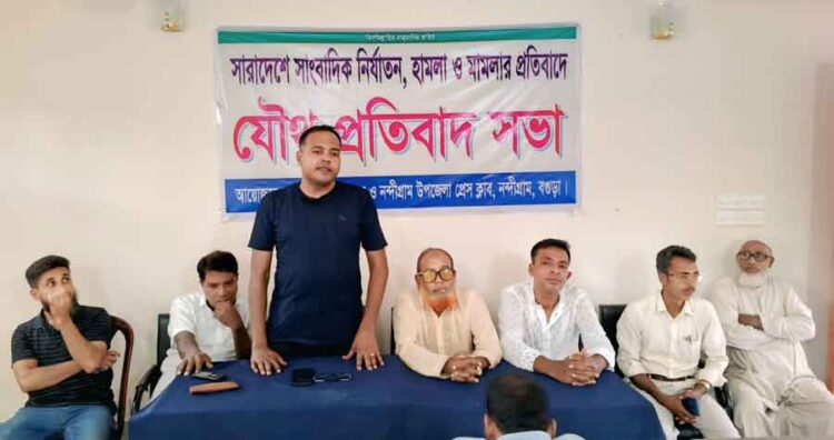সারাদেশে সাংবাদিক নির্যাতন, হামলা ও মিথ্যা মামলার বিরুদ্ধে নন্দীগ্রাম প্রেস ক্লাব এবং নন্দীগ্রাম উপজেলা প্রেস ক্লাবের উদ্যোগে এক যৌথ প্রতিবাদ সভা অনুষ্ঠিত হয়েছে। এ ঘটনা গণমাধ্যমের স্বাধীনতা ও সমাজের বিবেকের জন্য একটি উদ্বেগের কারণ হয়ে উঠছে। সোমবার (২৯ সেপ্টেম্বর) বিকেলে নন্দীগ্রাম মডেল সরকারি প্রাথমিক বিদ্যালয় কক্ষে এ প্রতিবাদ সভা অনুষ্ঠিত হয়। সভার সভাপতিত্ব করেন নন্দীগ্রাম উপজেলা প্রেস ক্লাবের সভাপতি ফজলুর রহমান এবং সঞ্চালনা করেন নন্দীগ্রাম প্রেস ক্লাবের সাধারণ সম্পাদক মনিরুজ্জামান। বিভিন্ন পর্যায়ের নেতৃবৃন্দ ও সাংবাদিকরা এই সভায় অংশ নেন। বক্তারা বলেন, সারাদেশে সাংবাদিকদের ওপর নির্যাতন, হামলা ও মিথ্যা মামলা একটি দুঃখজনক পরিস্থিতি সৃষ্টি করেছে। এইসব ঘটনা স্বাধীন সাংবাদিকতার জন্য বড় বিঘ্নতা ডেকে আনছে। সাংবাদিকদের এসব নির্যাতন বন্ধে সরকার ও সংশ্লিষ্ট কর্তৃপক্ষ দ্রুত ব্যবস্থা নেওয়ার আহ্বান জানানো হয়। তারা আরও উল্লেখ করেন, কুচক্রী মহলের ইন্ধনে নন্দীগ্রামে কর্মরত এক সাংবাদিকের নামে যে সব মিথ্যা মামলা হয়েছে, সেগুলো অবিলম্বে প্রত্যাহার ও বিচার দাবি করেন। না হলে কঠোর আন্দোলনের চিন্তাও প্রকাশ করেন বক্তারা। এই আন্দোলনের মাধ্যমে সত্য ও সুবিচার প্রতিষ্ঠা করতে সর্বস্তরের মানুষের সহযোগিতা কামনা করা হয়।
