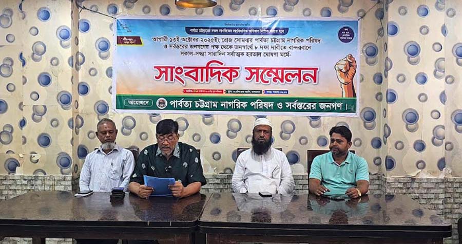 পার্বত্য চট্টগ্রামে স্থায়ী শান্তি ও ন্যায্য অধিকার প্রতিষ্ঠার দাবিতে আগামী ১৩ অক্টোবর সকাল থেকে সন্ধ্যা পর্যন্ত বান্দরবানে সর্বাত্মক হরতালের ঘোষণা দিয়েছে পার্বত্য চট্টগ্রাম নাগরিক পরিষদ। এই হরতাল পালনের মূল লক্ষ্য হলো দেশের কেন্দ্রীয় নাগরিক ঐক্য ও সাংবিধানিক অধিকার বাস্তবায়নের জন্য সোচ্চার হওয়া।