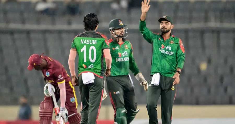 তারপরের ঘটনা ছিল একেবারে একতরফা—ক্রিস স্পিনারদের সামনে ক্যারিবীয় ব্যাটাররা অসহায় আত্মসমর্পণ করেন। শুরুতে নাসুম আহমেদ দারুণ নিয়ন্ত্রণে ৬ ওভারে মাত্র ১১ রানে ৩ উইকেট নিয়েছেন। তার সঙ্গে তানভির ইসলাম (২/১৬) ও রিশাদ হোসেন (৩/৫৪) অসাধারণ পারফরম্যান্স দেখান। দলের নেতৃত্বে থাকা মিরাজও রেখে যান নিজের ছাপ, নেন ২ উইকেট।