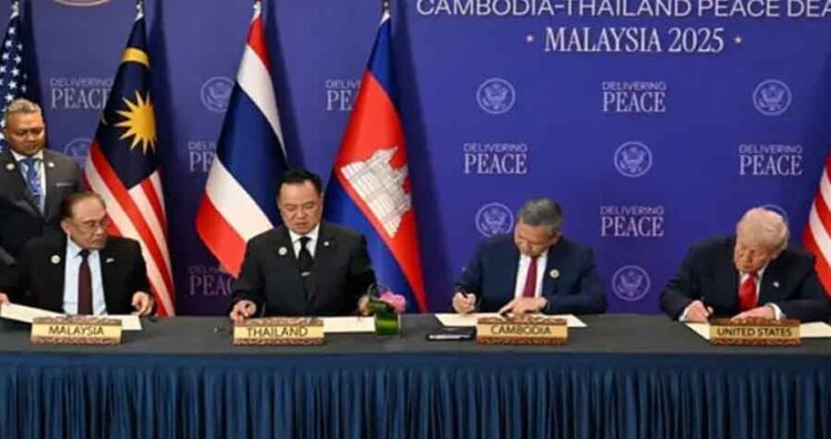 যুক্তরাষ্ট্রের প্রেসিডেন্ট ডোনাল্ড ট্রাম্পের উপস্থিতিতে থাইল্যান্ড ও কম্বোডিয়ার মধ্যে দীর্ঘ সময় ধরে চলমান সংঘর্ষের ক্ষেত্রে একটি গুরুত্বপূর্ণ যুদ্ধবিরতি চুক্তি স্বাক্ষরিত হয়েছে। মালয়েশিয়ার রাজধানী কুয়ালালামপুরে এই ঐতিহাসিক চুক্তিতে স্বাক্ষর করেন ট্রাম্প নিজেও, সাথে উপস্থিত ছিলেন মালয়েশিয়ার প্রধানমন্ত্রী আনোয়ার ইব্রাহিম। খবর আল জাজিরার।