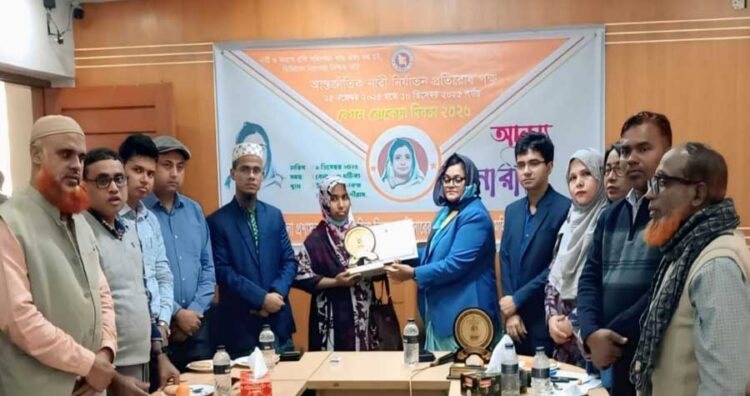 বগুড়ার নন্দীগ্রামে আন্তর্জাতিক নারী নির্যাতন প্রতিরোধ পক্ষ ও বেগম রোকেয়া দিবসের উপলক্ষে পাঁচজন মহীয়সী নারীকে সম্মাননা জানানো হয়েছে। এ অনুষ্ঠানে মঙ্গলবার (৯ ডিসেম্বর) সকাল সাড়ে ১০টায় উপজেলা প্রশাসন এবং উপজেলা মহিলা বিষয়ক কার্যালয়ের যৌথ আয়োজনে উপজেলা পরিষদ সভাকক্ষে একটি আলোচনা সভা অনুষ্ঠিত হয়। সভাপতিত্ব করেন উপজেলা নির্বাহী কর্মকর্তা শারমিন আরা এবং সঞ্চালনা করেন উপজেলা মহিলা বিষয়ক কর্মকর্তা সুলতানা আকতার বানু। এতে বিভিন্ন বিভাগের কর্মকর্তা ও কর্মচারী, স্থানীয় নেতৃবৃন্দ ও জয়িতাদের স্বজনরা উপস্থিত ছিলেন।