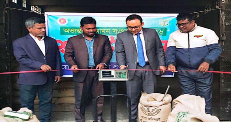 কুড়িগ্রামের উলিপুরে অভ্যন্তরীণ আমন ধান সংগ্রহ ২০২৫-২৬ এর শুভ উদ্বোধন করা হয়েছে। মঙ্গলবার (৯ ডিসেম্বর) বিকেলে উলিপুর উপজেলা খাদ্য গুদামে চলমান অর্থবছরের আমন ধান ও চাল সংগ্রহের কার্যক্রমের আনুষ্ঠানিক উদ্বোধন করেন উপজেলা নির্বাহী অফিসার মাহামুদুল হাসান। এ অনুষ্ঠানে উপস্থিত ছিলেন উপজেলা বিএনপি’র সদস্য সচিব, চাল মিল চাতাল মালিক সমিতির সভাপতি হায়দার আলী মিঞা, উপজেলা খাদ্য নিয়ন্ত্রক মো. মিসবাহুল হোসাইন, খাদ্য গুদামের ভারপ্রাপ্ত কর্মকর্তা মোহাম্মদ আলী, সাধারণ সম্পাদক মো. দুলাল মিয়া, উপজেলা পল্লী উন্নয়ন কর্মকর্তা মো. লোকমান হোসেন, শিক্ষা কর্মকর্তা মোছা. নার্গিস ফাতিমা তোকদার, সাংবাদিক খালেক পারভেজ লালু, মিল চাতাল মালিক সমিতির সদস্য আ. রহিম বাবুসহ অন্যরা।