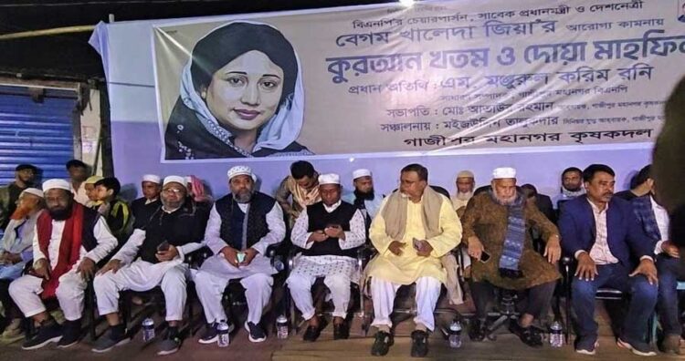 গাজীপুর মহানগরীর ২৭ নম্বর ওয়ার্ডের তালুকদার পুকুর পাড়ে শুক্রবার সন্ধ্যায় বিএনপির চেয়ারপার্সন ও সাবেক প্রধানমন্ত্রী বেগম খালেদা জিয়ার দ্রুত সুস্থতা ও উন্নত স্বাস্থ্য কামনায় এক বিশেষ কুরআন খতম ও দোয়া মাহফিল অনুষ্ঠিত হয়েছে। একইসঙ্গে তার রুহের মাগফিরাত ও শান্তির জন্যও দোয়া করা হয়েছে।