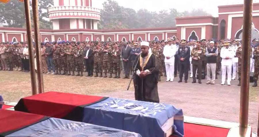 সুদানে জাতিসংঘের শান্তিরক্ষা মিশনে কাজরত ছয় বাংলাদেশি শান্তিরক্ষীর জানাজা সম্পন্ন হয়েছে এবং তাঁদের দাফন কার্যক্রম গ্রামের বাড়িতে সম্পন্ন হচ্ছে। রবিবার (২১ ডিসেম্বর) সকাল সোয়া ৯টার পর ঢাকা সেনানিবাসের কেন্দ্রীয় মসজিদে এই জানাজার নামাজ অনুষ্ঠিত হয়। জানাজার পর শহীদদের মরদেহে রাষ্ট্রপতি এবং প্রধান উপদেষ্টার পক্ষ থেকে ফুলেল শ্রদ্ধা জানানো হয়। এরপর তিন বাহিনী থেকে একে একে শহীদদের কফিনে শ্রদ্ধা নিবেদন করা হয়। শান্তিরক্ষীদের মরদেহবাহী হেলিকপ্টার সবুজ পতাকাজড়ানো মরদেহ নিয়ে প্রত্যেকের নিজ নিজ জেলায় রওনা দেয়। জানাজার আগে নিহত শান্তিরক্ষীদের জীবনবৃত্তান্ত পাঠ করে শোনানো হয় এবং তাঁদের জন্য আত্মার মাগফিরাত কামনা করে দোয়া ও দোয়া করা হয়। নিহত ছয় শান্তিরক্ষীর মধ্যে ছিলেন নাটোরের করপোরাল মো. মাসুদ রানা, কুড়িগ্রামের সৈনিক মো. মমিনুল ইসলাম ও শান্ত মন্ডল, রাজবাড়ীর সৈনিক শামীম রেজা, কিশোরগঞ্জের মেস ওয়েটার মোহাম্মদ জাহাঙ্গীর আলম এবং গাইবান্ধার মো. সবুজ মিয়া। এর আগে, ২০ ডিসেম্বর সকালে নিহতদের মরদেহ বহনকারী বিশেষ ফ্লাইটটি ঢাকার হজরত শাহজালাল আন্তর্জাতিক বিমানবন্দরে অবতরণ করে। এসময় বাংলাদেশ সেনাবাহিনীর প্রধান জেনারেল স্টাফ লেফটেন্যান্ট জেনারেল মিজানুর রহমান শামীম মরদেহ গ্রহণ করেন। আহতদের মধ্যে রয়েছেন কুষ্টিয়ার লেফটেন্যান্ট কর্নেল খোন্দকার খালেকুজ্জামান, দিনাজপুরের সার্জেন্ট মো. মোস্তাকিম হোসেন, ঢাকার করপোরাল আফরোজা পারভিন ইতি, বরগুনার ল্যান্স করপোরাল মহিবুল ইসলাম, কুড়িগ্রামের সৈনিক মো. মেজবাউল কবির, রংপুরের সৈনিক মোসা. উম্মে হানি আক্তার, মানিকগঞ্জের সৈনিক চুমকি আক্তার এবং নোয়াখালীর সৈনিক মো. মানাজির আহসান। উল্লেখ্য, ২০২২ সাল থেকে জাতিসংঘের শান্তিরক্ষা মিশন ‘ইউনাইটেড নেশনস ইন্টারিম সিকিউরিটি ফোর্স ফর আবেই’ (UNISFA)-তে বাংলাদেশের একটি ব্যাটালিয়ন মোতায়েন রয়েছে।