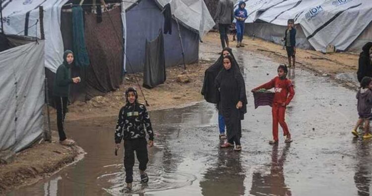 গাজায় বৃষ্টি ও হাড়কাঁপানো শীতে মানুষের দুর্ভোগ যেন অশেষে পৌঁছেছে। রক্তঝরা যুদ্ধের মধ্যেও প্রকৃতি যেন আরও কঠোর হয়ে দাঁড়িয়ে গেছে এই উপত্যকায়। শনিবার (২৭ ডিসেম্বর) প্রবল নিম্নচাপের কারণে গাজা উপত্যকায় প্রতিদিনের জীবন ঢেকে গেছে পানির স্তূপে। এই শীতে এটি তৃতীয় দফার নিম্নচাপ হলেও, গতকাল সোমবার আরও শক্তিশালী চতুর্থ দফার ঝড়ের আশঙ্কায় গাজাবাসীরা আতঙ্কে আছে, খবর আলজাজিরার। গাজার এক বাসিন্দা মোহাম্মদ মাসলাহ কষ্টের সঙ্গে বলতে উল্লেখ করেন, আমাদের ঘরবাড়ি এখন ইসরায়েলের দখলে, আশ্রয় কেন্দ্রেও আমাদের অবস্থা ভালো নয়। সর্বত্র পানির স্রোত। চীনদেশের জাবালিয়া থেকে পালিয়ে আসা চার সন্তানের মা শাইমা ওয়াদি জানান, দীর্ঘ দুই বছর ধরে তাবুতে থাকায় তারা সবাই ক্লান্ত। গদি বা শিশুসাধ্য গরম কাপড়েরও সংকট রয়েছে। এই ডিসেম্বর মাসে তীব্র ঠাণ্ডা ও বৃষ্টির কারণে কমপক্ষে ১৫ জনের মৃত্যু হয়েছে, এর মধ্যে তিন শিশু রয়েছে। চিকিৎসকদের মতে, ভিজা কাপড় এবং খোলা আকাশের নিচে থাকার ফলে তারা হাইপোথার্মিয়ায় আক্রান্ত হয়ে মারা গেছে। মানবিক সংস্থাগুলোর হুঁশিয়ারি, যদি এখনই যথাযথ ত্রাণ এবং আশ্রয় প্রদান না করা হয়, তাহলে মৃত্যুর মিছিল আরও দীর্ঘ হতে পারে। গাজার সিভিল ডিফেন্সের এক মুখপাত্র ইব্রাহিম আবু আল-রিশ বলেন, বৃষ্টির জল ডুবিয়ে ধ্বংসস্তূপের মধ্যে মানুষকে উদ্ধার করতে প্লাস্টিকের তোয়ালে দিয়ে তাবুগুলো ঢেকে দেওয়ার চেষ্টা চলছে।